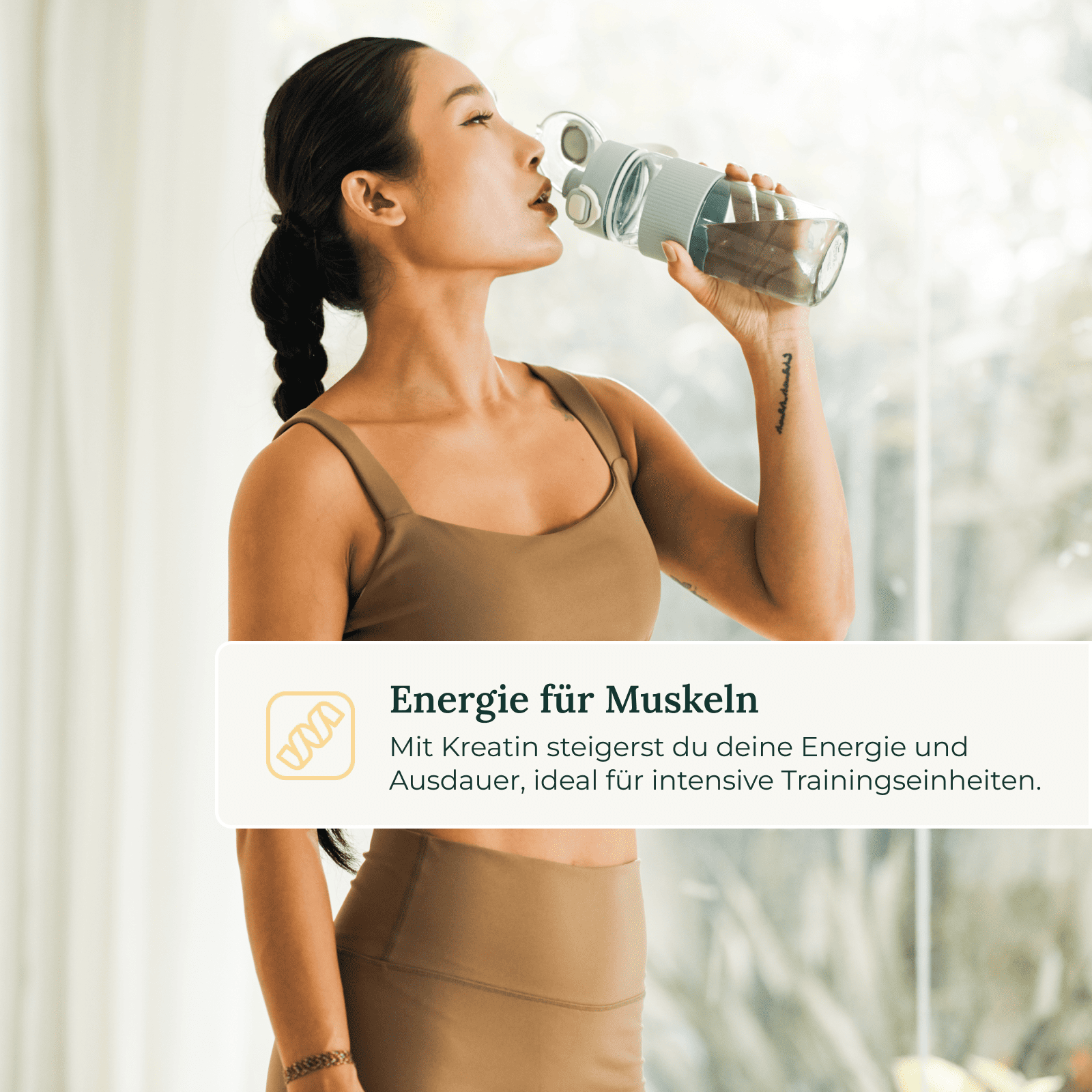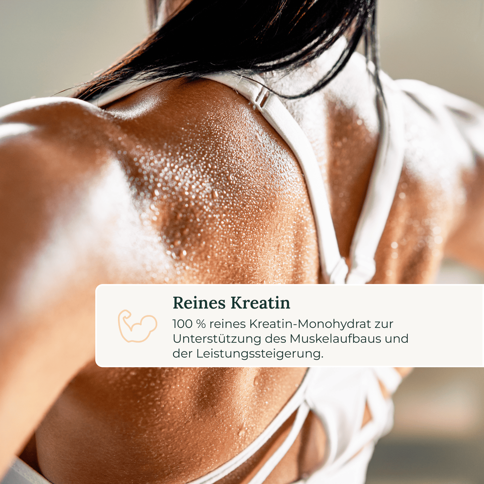 Creatin zieht Wasser in die Muskelzellen, was Volumen, Fülle und Leistungsfähigkeit unterstützt.
